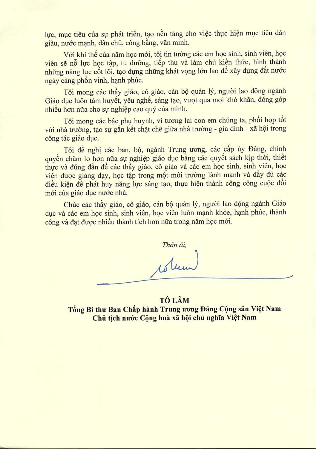 Thư của tổng bí thư, chủ tịch nước Tô Lâm gửi ngành giáo dục nhân dịp khai giảng năm học mới 2024-2025